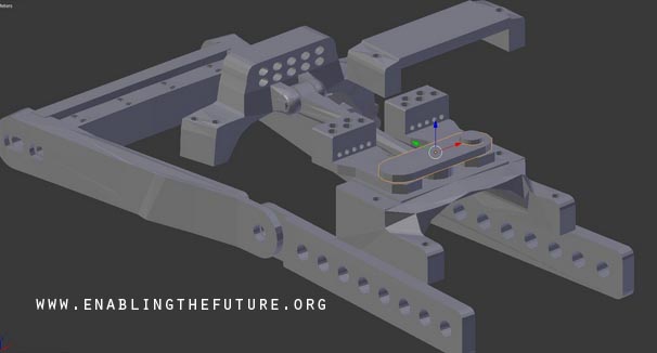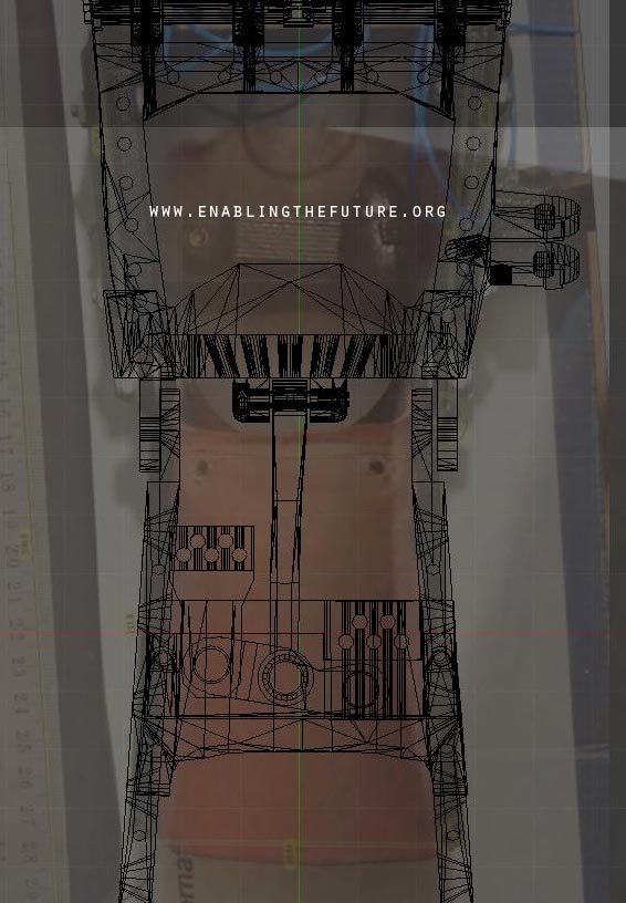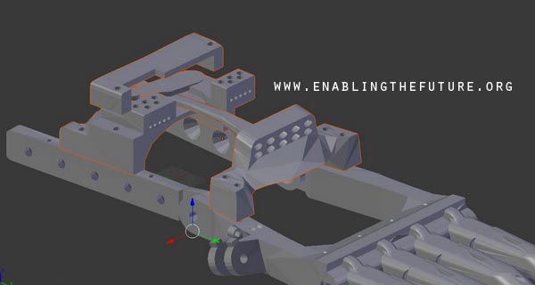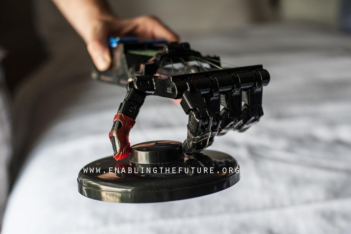 “In the summer of 2013, my son Peregrine and I saw a video of Liam, a little boy who was born without fingers on one hand, just like Peregrine. He was wearing a mechanical 3D printed hand and using it to pick up objects. We downloaded and printed off a Snap-Pin Robohand and fitted it to him by cutting and heat-bending the plastic parts, then mounting them onto a leather “shoe and sleeve”. Thus began our journey with open-source assistive devices. The fingers close via cables that run on the front side of mechanical fingers, and they open via elastics that run in channels on the back side of those fingers.