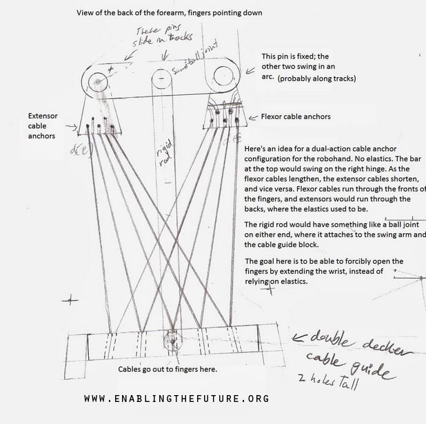 After wearing and using his new hand, Peregrine started making suggestions to improve the design. One of his first wishes after fitting the hand was to somehow reduce or eliminate resistance as he closes his hand. To grasp something small requires a lot of sustained force, since the five elastics fight back with a high level of resistance and that resistance increases as the hand closes more.